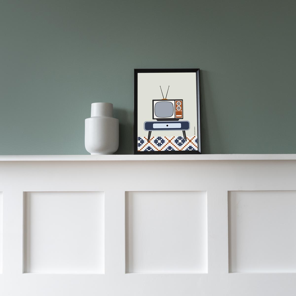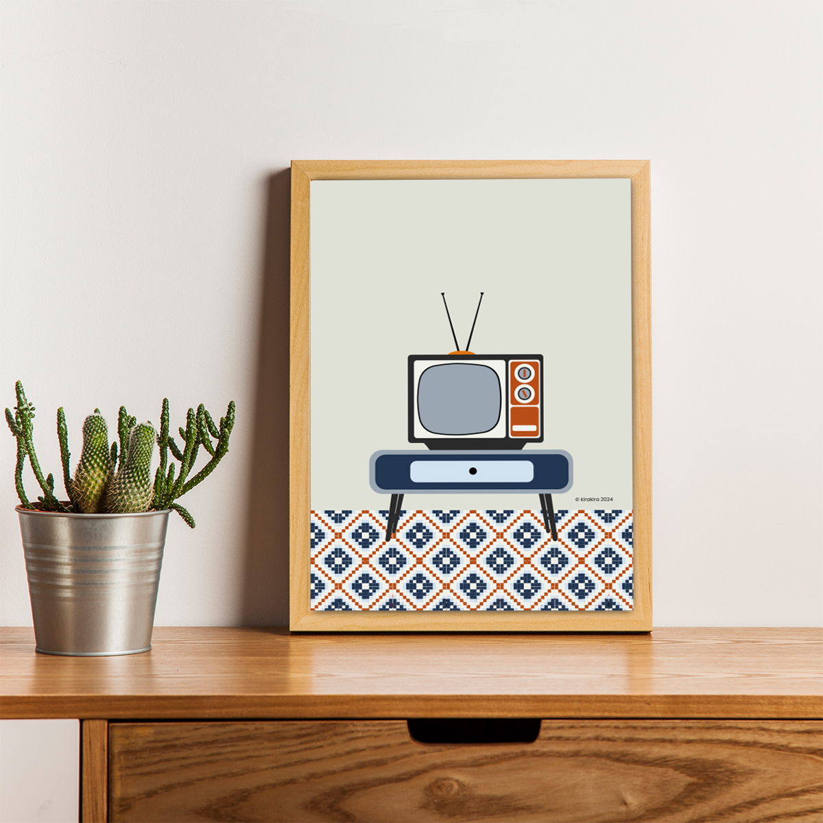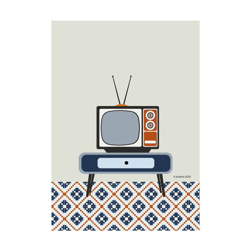 Ilustración de objeto vintage. Televisión de los años sesenta en entorno típico de una casa Valenciana. La paleta de color es de colores rosas y amarillos.