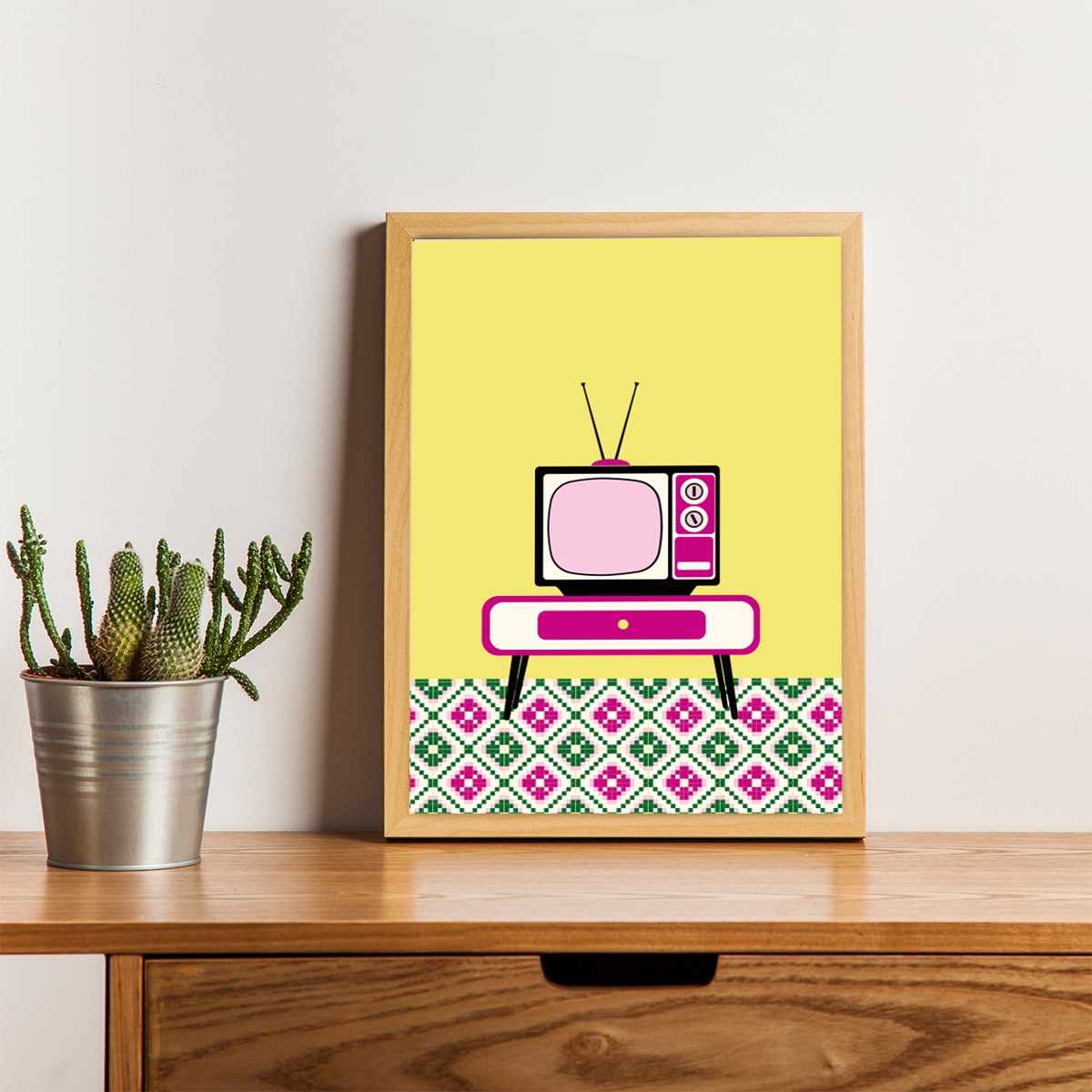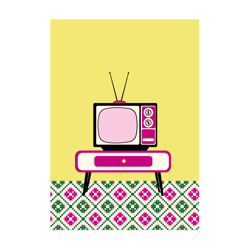 Ilustración de objeto vintage. Televisión de los años sesenta en entorno típico de una casa Valenciana. La paleta de color es de colores rosas y amarillos.